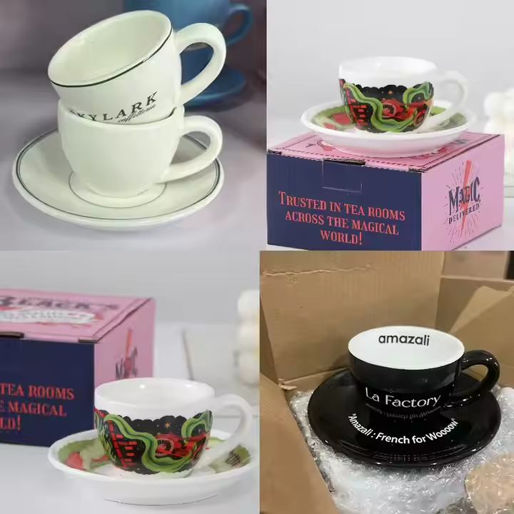 Ensemble tasse à café et soucoupe américaines personnalisées Tasse à cappuccino espresso en céramique de style design moderne avec logo, motif et texte