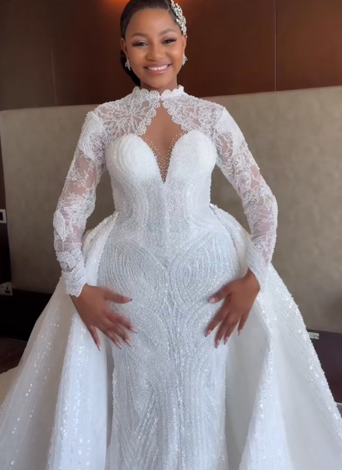 Robe de mariée sirène personnalisée en dentelle perlée brillante Aso Ebi avec traîne détachable et manches longues