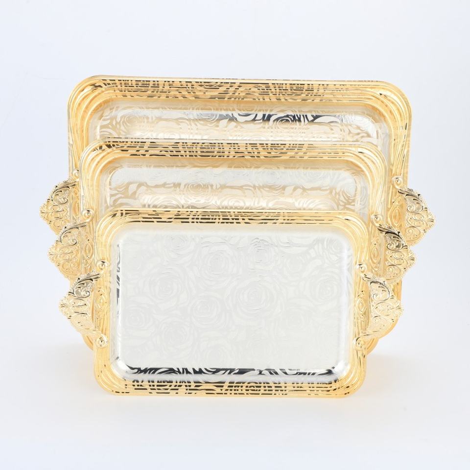 Plateau en métal rectangulaire de luxe de style arabe personnalisé ensemble de 3 plateaux de service en acier inoxydable avec poignées