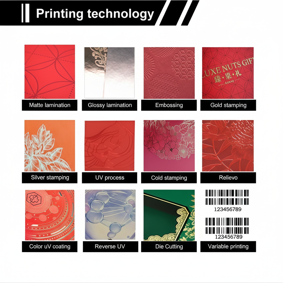 Impression numérique, Gaufrage, Gaufrage/Debossing, Impression flexographique, Timbre d'or, impression offset, IMPRESSION D'ÉCRAN DE SOIE, Impression UV