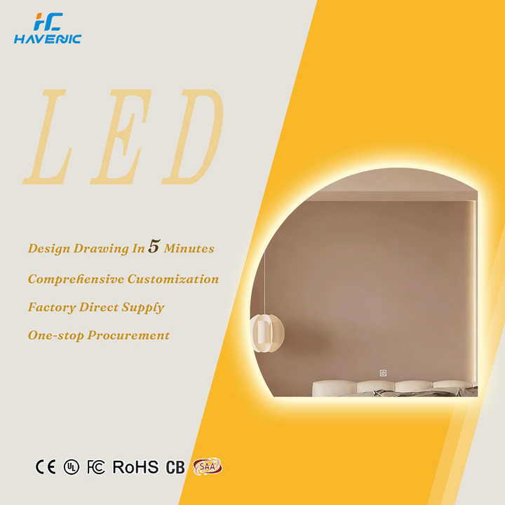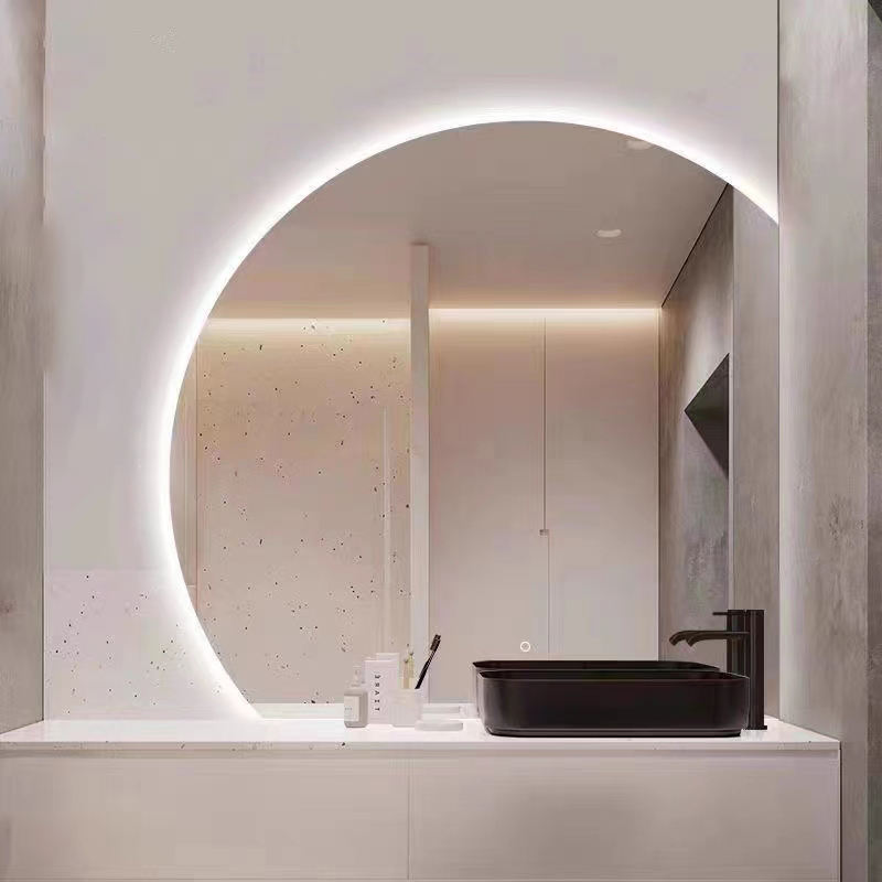 Miroir mural demi-lune en verre personnalisé pour chambre à coucher, miroir de salle de bain intelligent semi-circulaire à LED pour hôtel avec rétroéclairage
