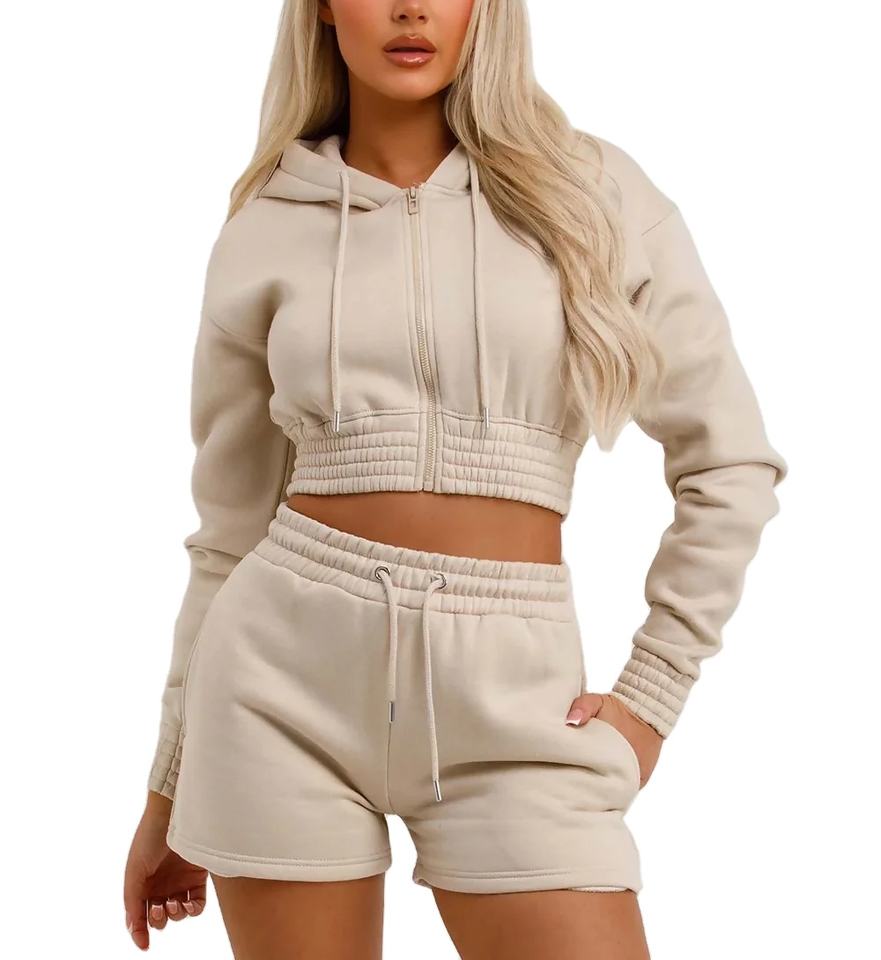 Ensemble 2 pièces beige personnalisé Sweats à capuche et shorts pour femmes à épaules tombantes Streetwear Ensemble de survêtement à capuche zippé et court