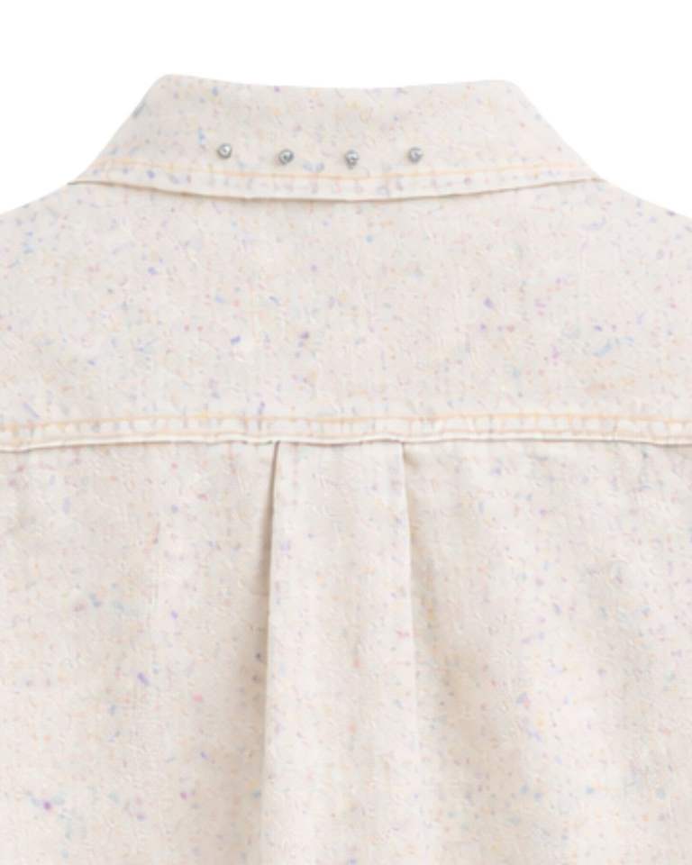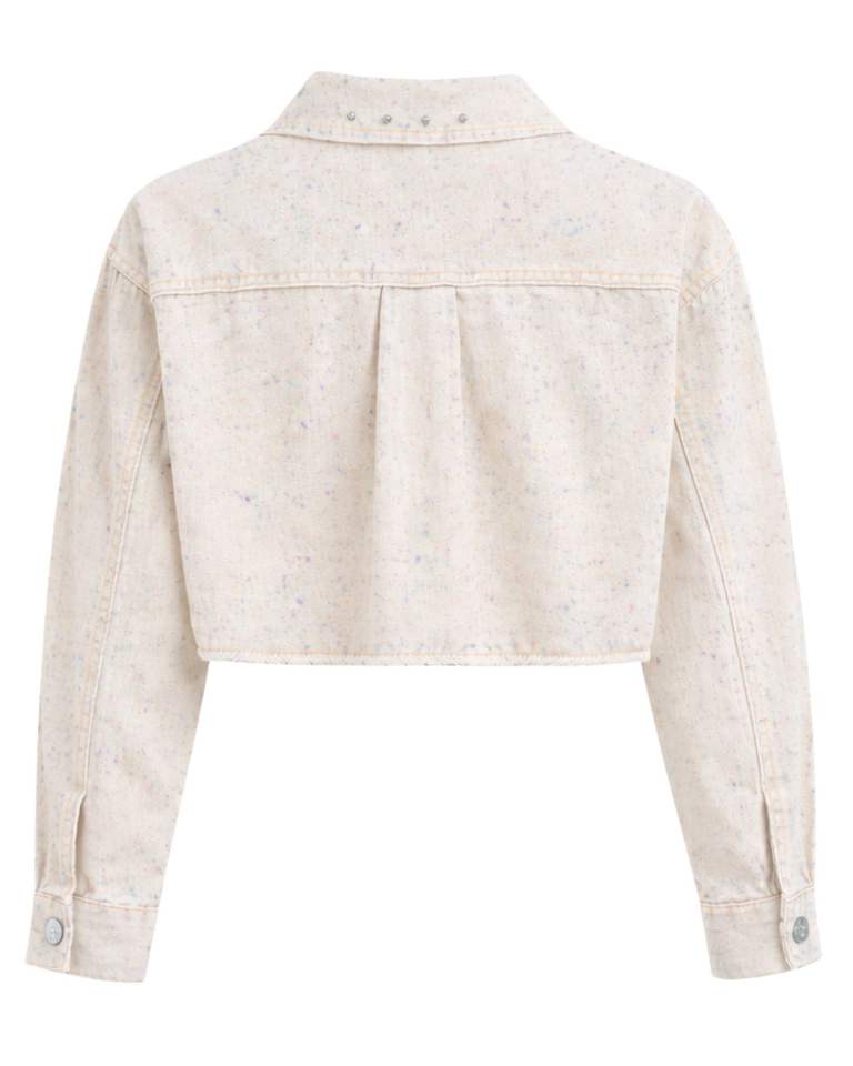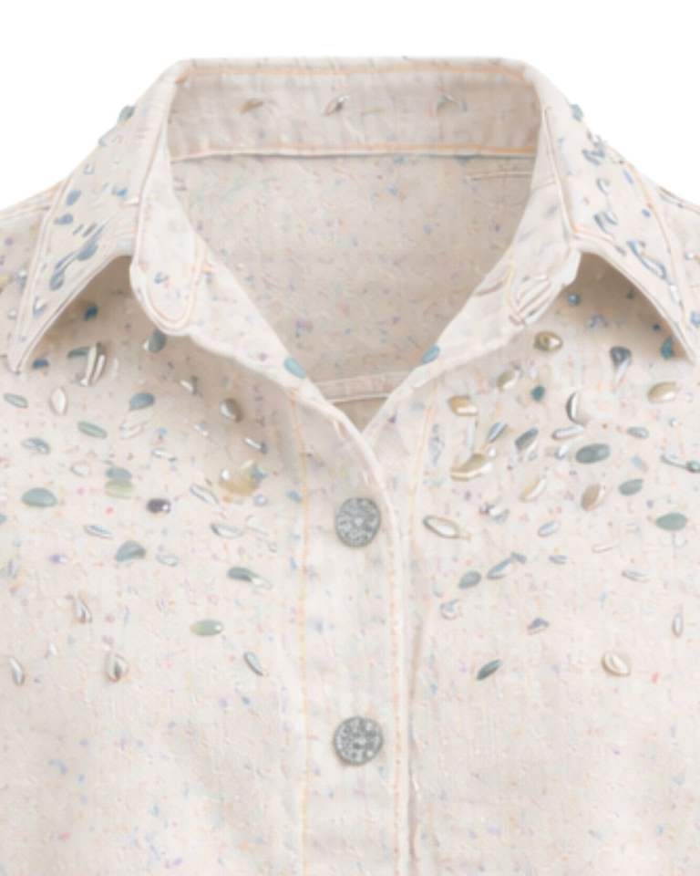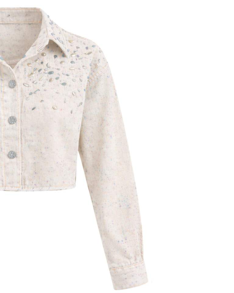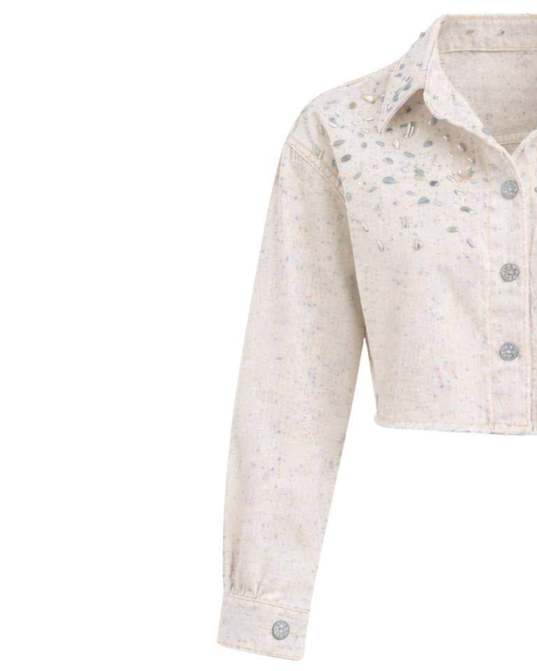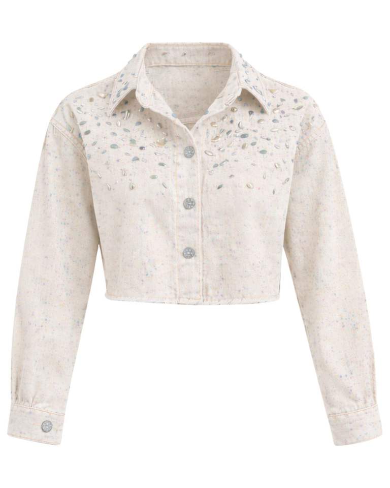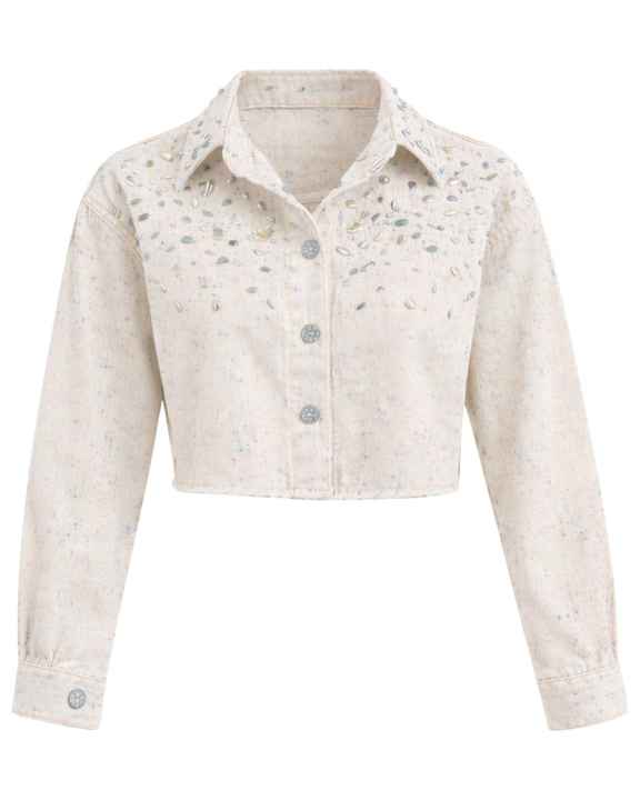 Veste en jean courte beige personnalisée pour femme avec fermeture boutonnée sur le devant ornée de strass, manches longues, style streetwear tendance