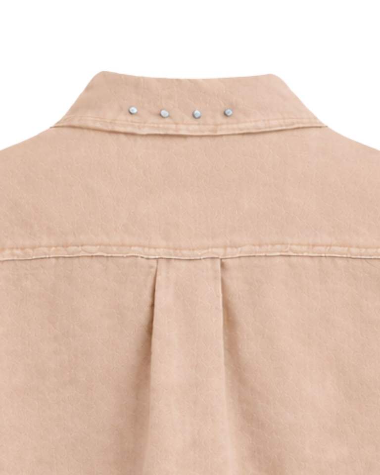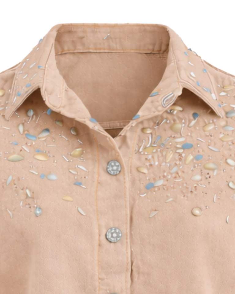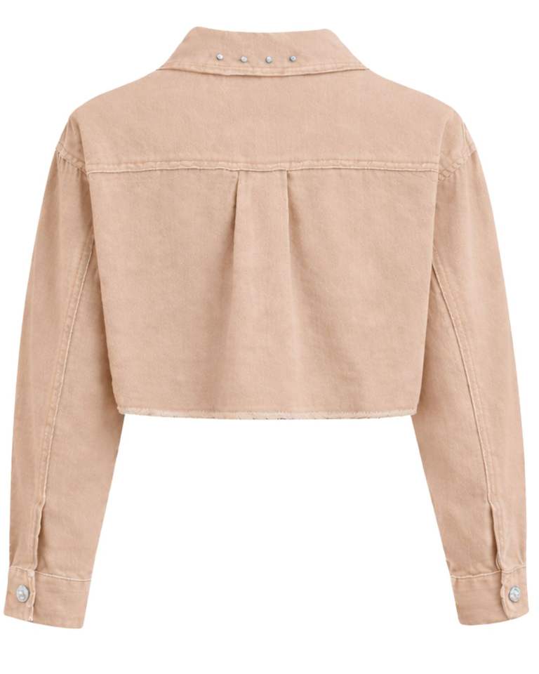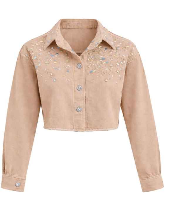 Veste en jean courte beige personnalisée pour femme avec boutons sur les épaules ornés de strass, manches longues, style décontracté et tendance