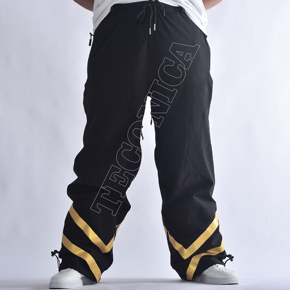 Customized Black Baggy Snow Pants with Gold Vinyl Design Hem Adjustable Waist Warm Fleece Lined and Cinched Bottom