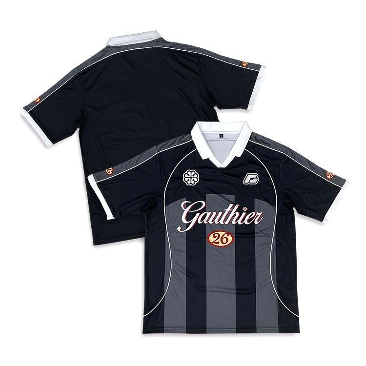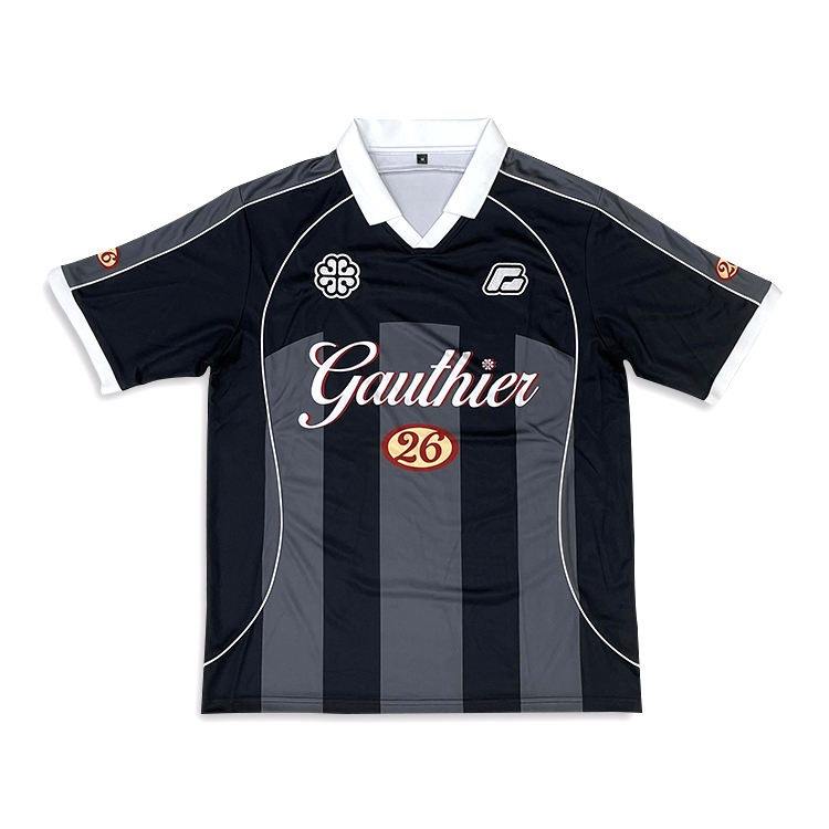 Maillot de football personnalisé noir en maille respirante imprimé, vente en gros, crop top personnalisé coupe carrée, manches courtes, col en V