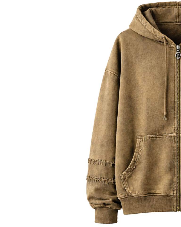 Sweat à capuche gothique personnalisé en denim délavé brun avec impression de chèvre du diable au dos, molleton lourd, streetwear, sweat à capuche zippé, look vintage personnalisé