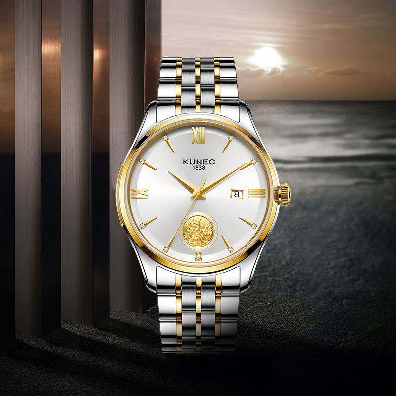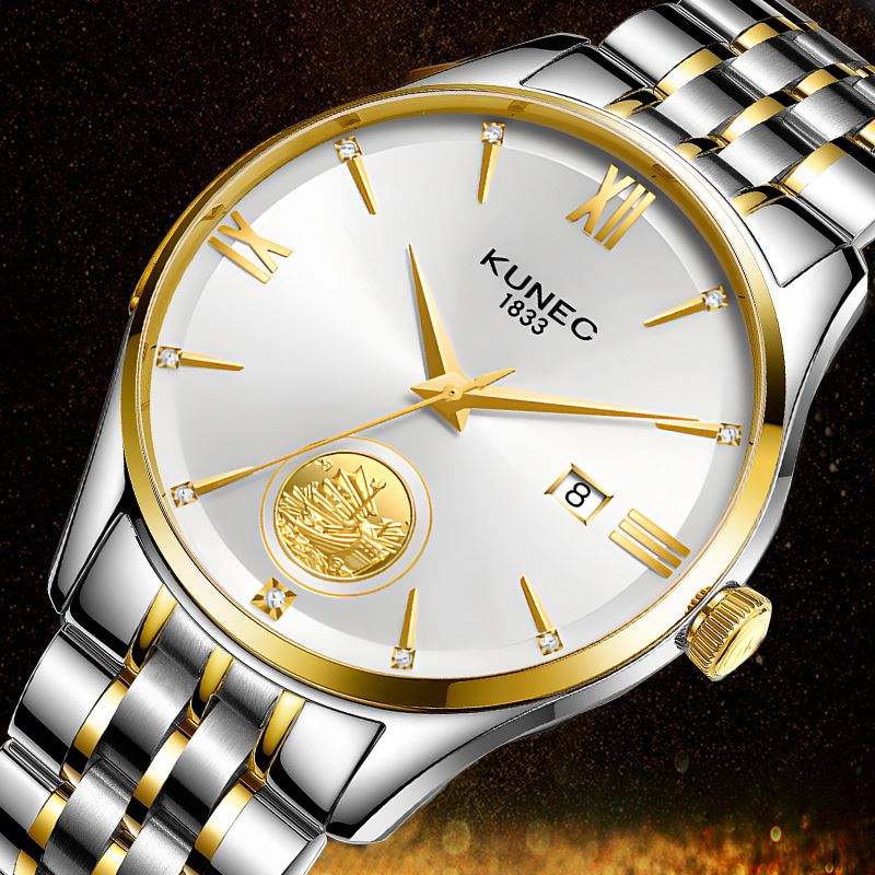 Montre pour homme haut de gamme, personnalisée, avec cadran à fenêtre calendrier, mouvement suisse, style business et mode.