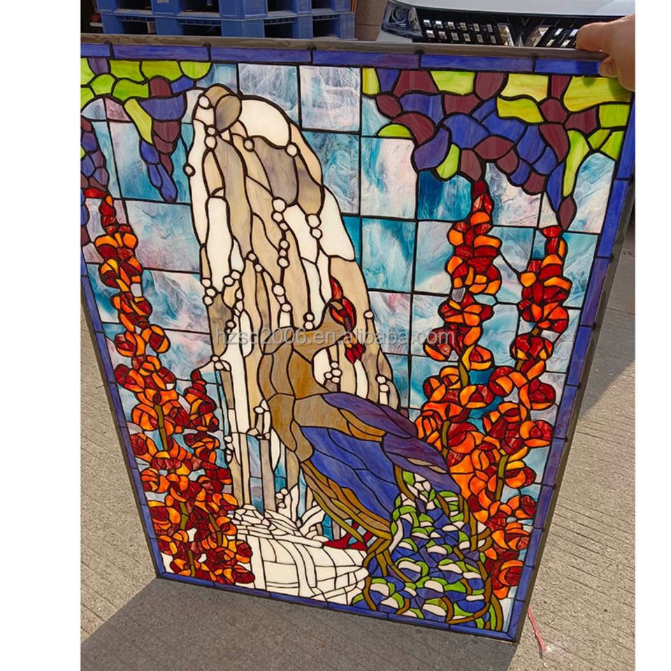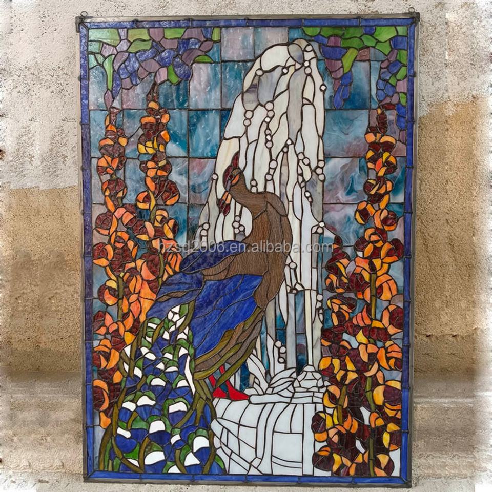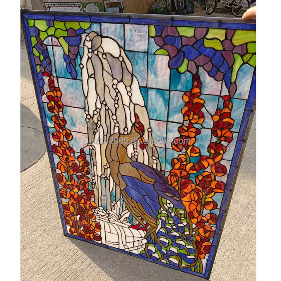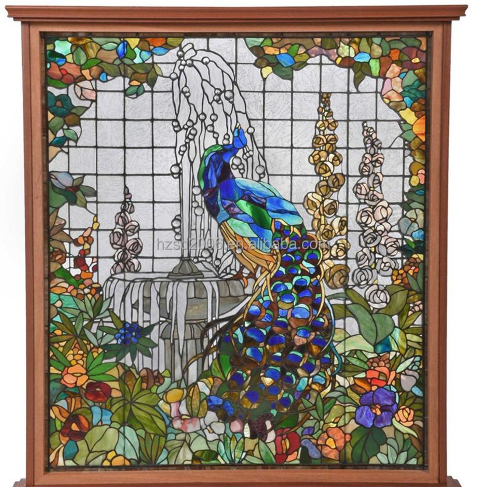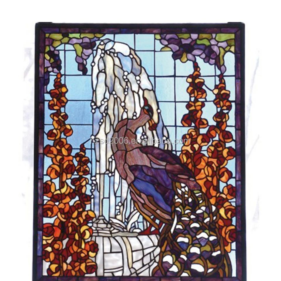 Vitrail personnalisé de style cathédrale chinoise, motif paon, double vitrage, style européen massif pour fenêtre, panneau, porte, mur
