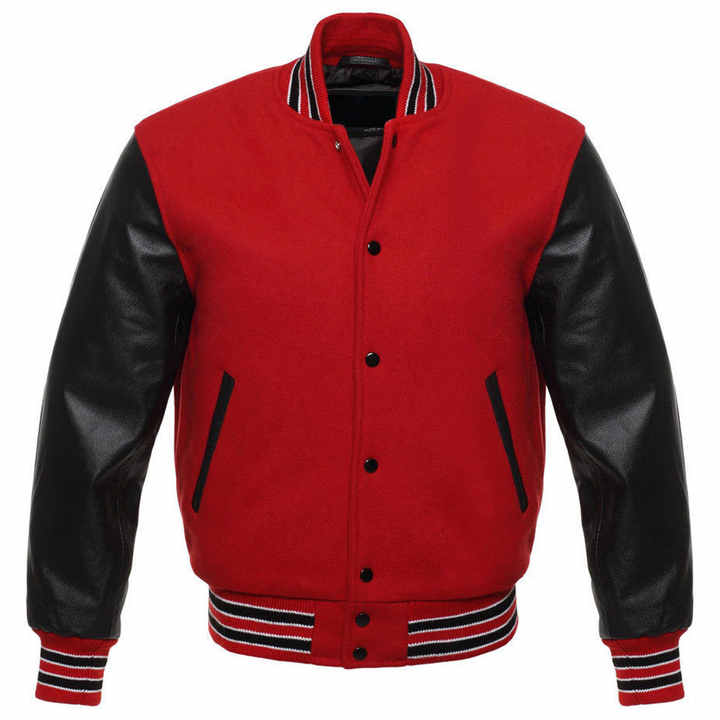 Veste de baseball universitaire personnalisée pour hommes, vêtements de sport, veste varsity, veste Letterman, corps en laine rouge et manches en cuir noir