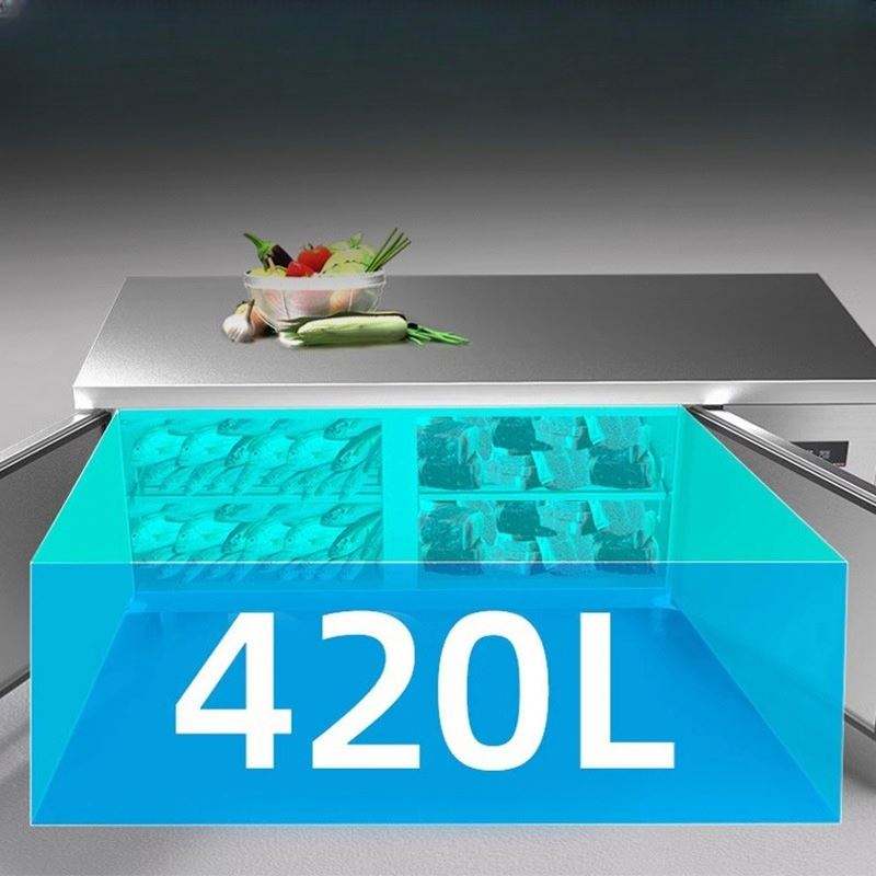 Plan de travail personnalisé avec réfrigérateur/refroidisseur intégré : Équipement de bar à salades refroidi par air pour cuisines commerciales.