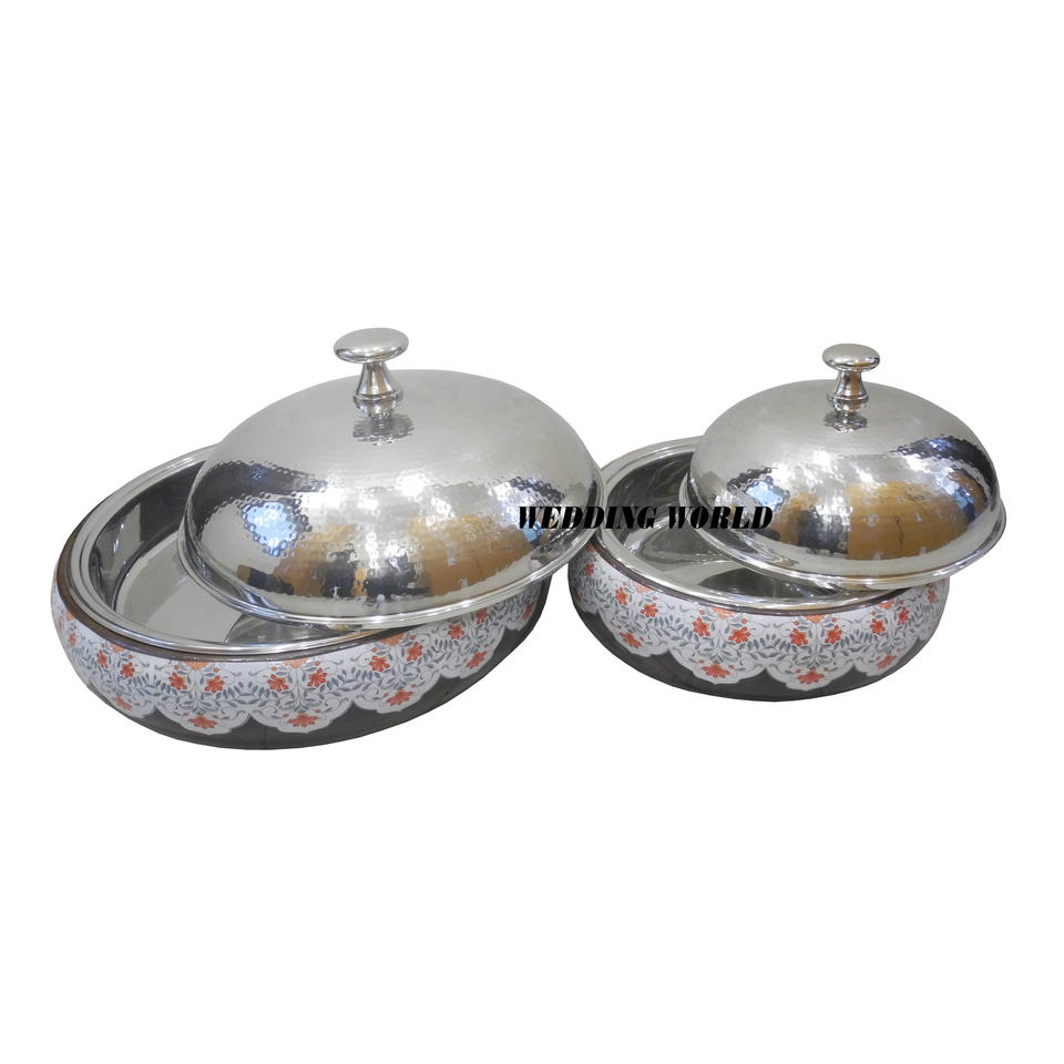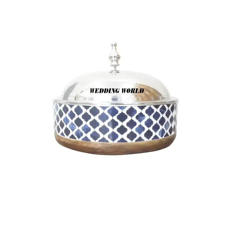 Casserole ronde en acier inoxydable de luxe minimaliste avec poignée en bois, support et moufles isolantes pour garder les aliments au chaud