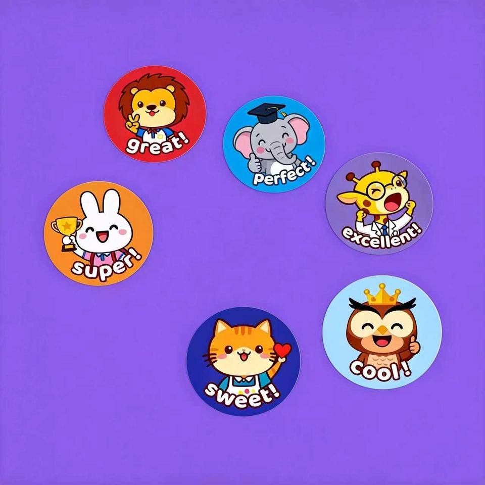 Autocollants de récompense en vinyle personnalisés, écologiques et amusants pour enfants, étiquettes colorées d'animaux de dessin animé, autocollants motivants pour enfants