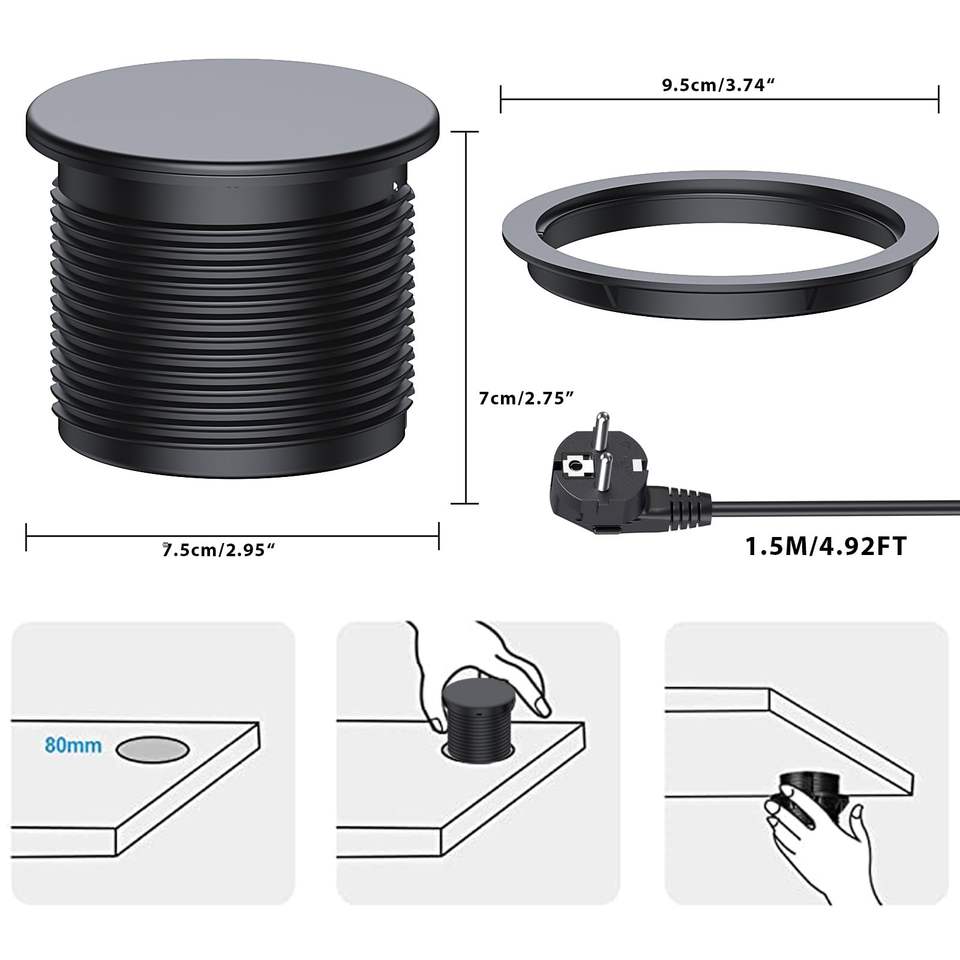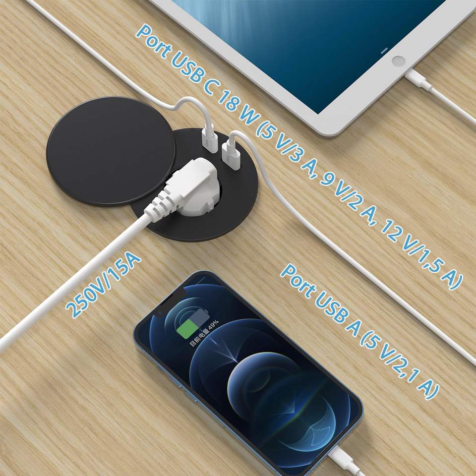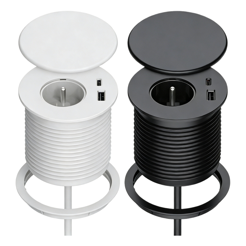 Prise encastrée personnalisée avec couvercle et port USB pour table de chevet, meuble ou bureau – Prise de courant ronde encastrée