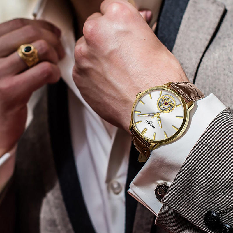 Montre pour homme avec bracelet en cuir véritable mécanique et mouvement tourbillon à lunette dorée personnalisée