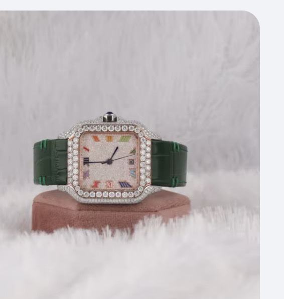 Montre personnalisée style Hip Hop pour homme avec bracelet en cuir vert et demi-sertie de diamants Moissanite