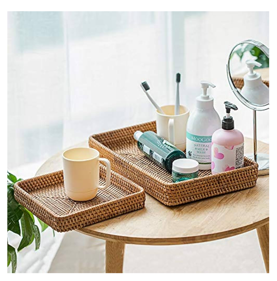 Plateau de service et de rangement en rotin tressé à la main personnalisé pour café, collations, petit-déjeuner, organisateur de coiffeuse ou panier de rangement pour vaisselle