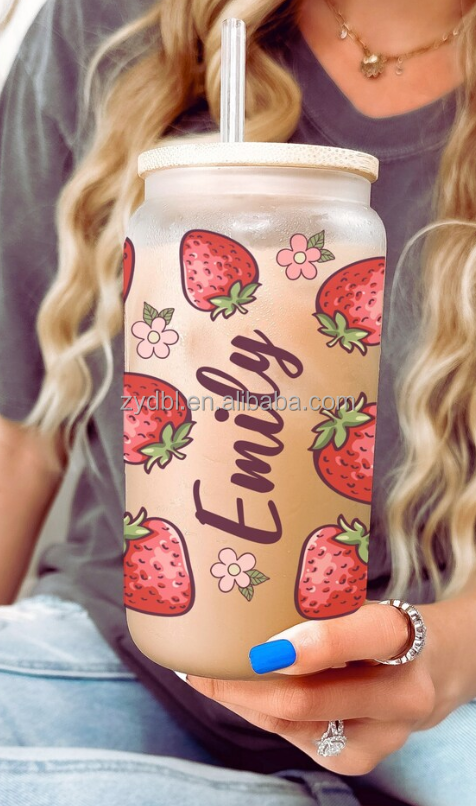 Tasse à boire personnalisée en verre borosilicate fait main, motif paille, avec design fraise, pour dîner en famille et entre amis