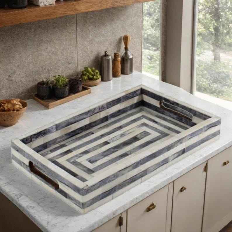Plateau de service rectangulaire en bois naturel artisanal de haute qualité avec incrustations en os, personnalisé pour la maison, les restaurants et les hôtels.