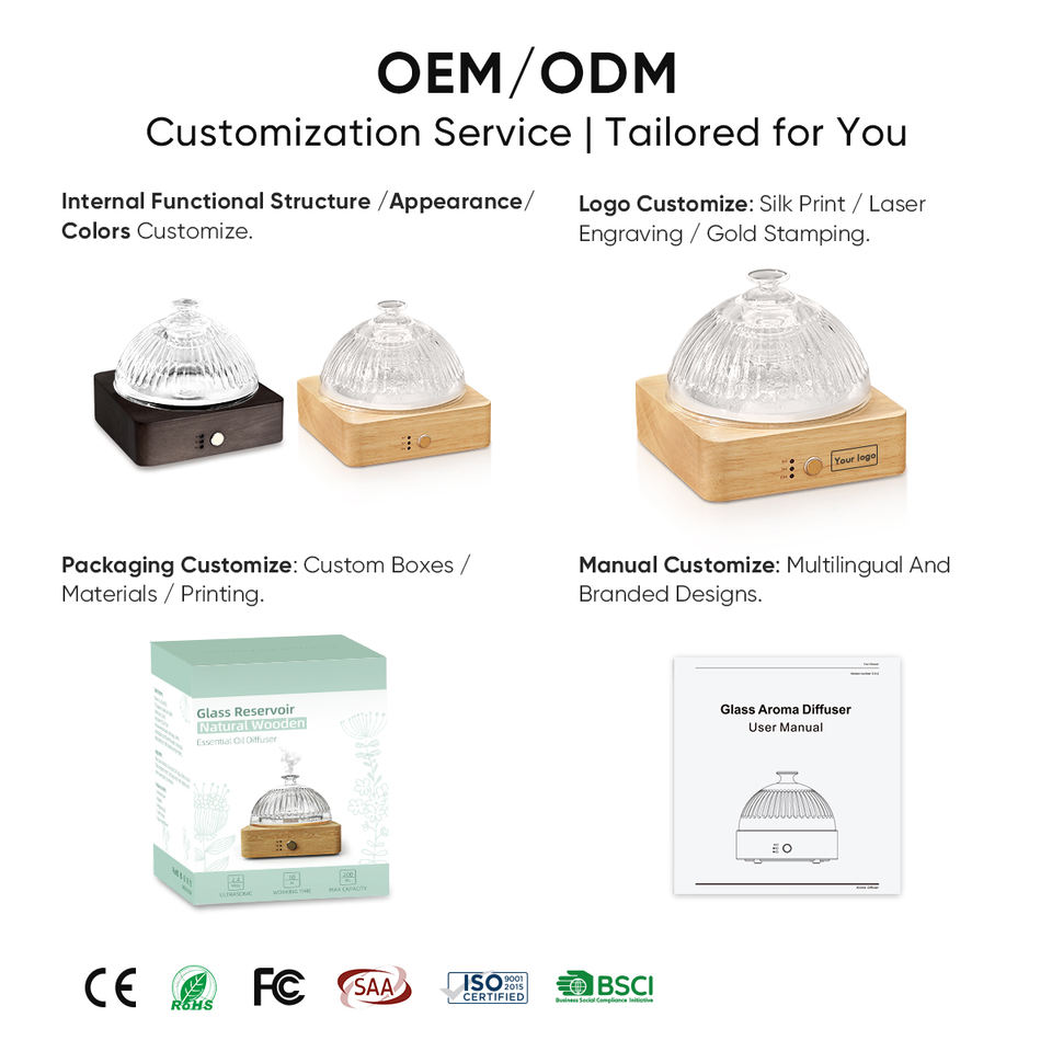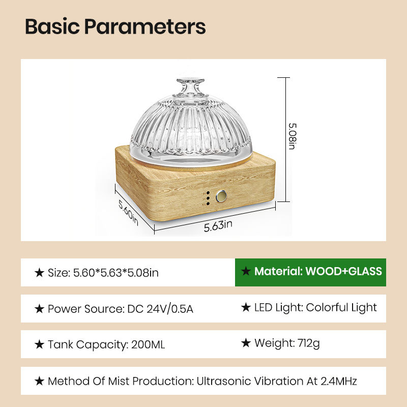 Couleurs:Base en bois véritable, réservoir en verre fait main et couverture en verre