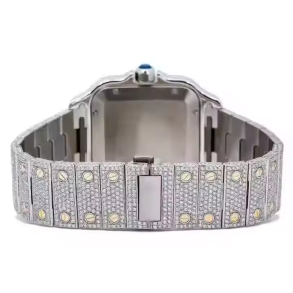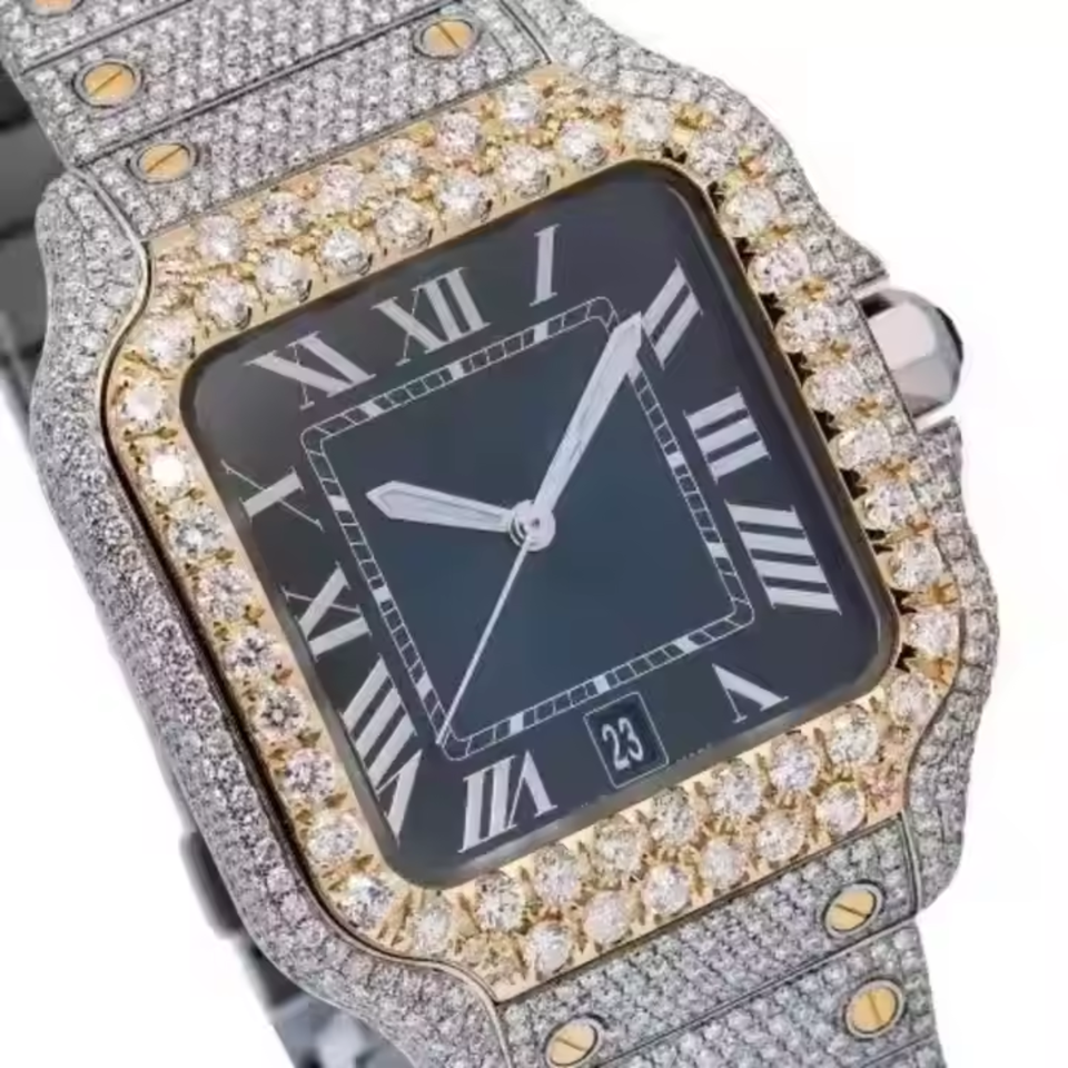 Montre analogique à quartz personnalisée Hip Hop glacée, cadran carré, chiffres romains antiques, bracelet en acier inoxydable, verre en moissanite de 41 mm