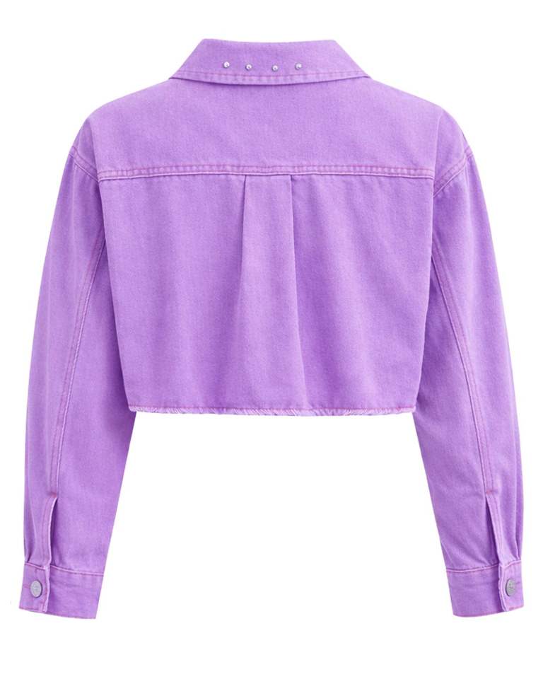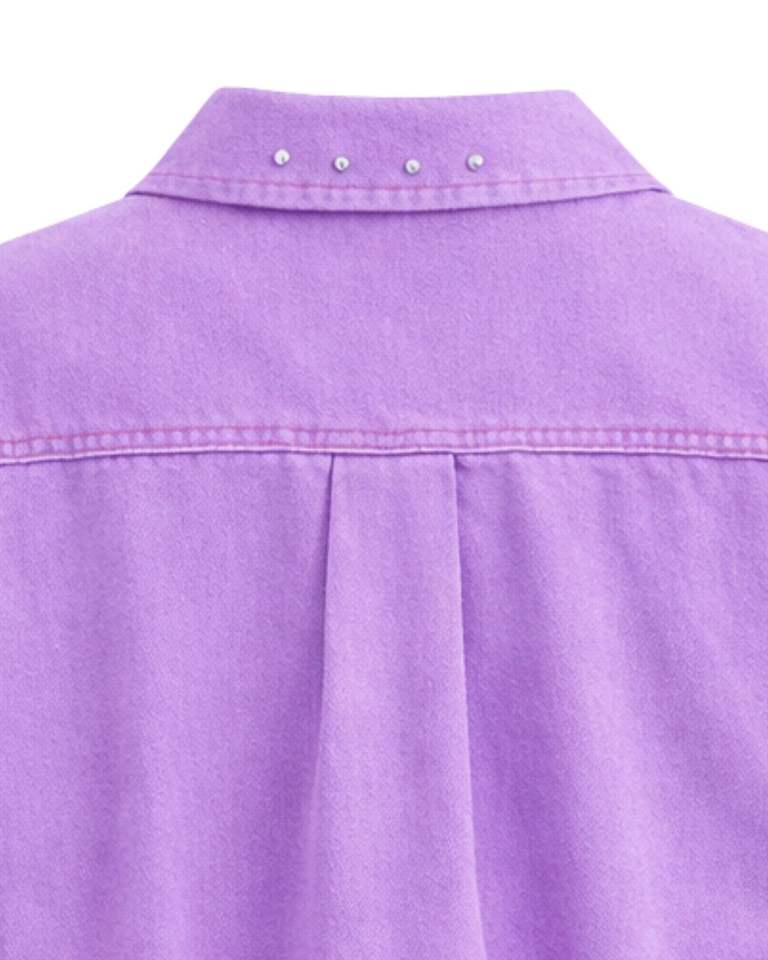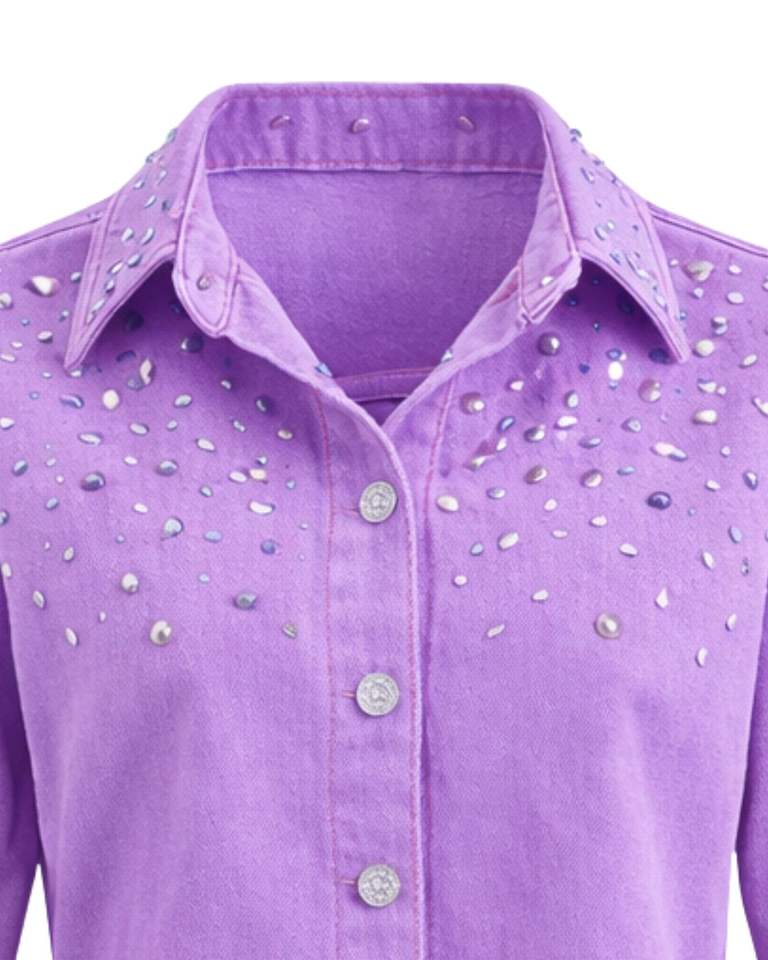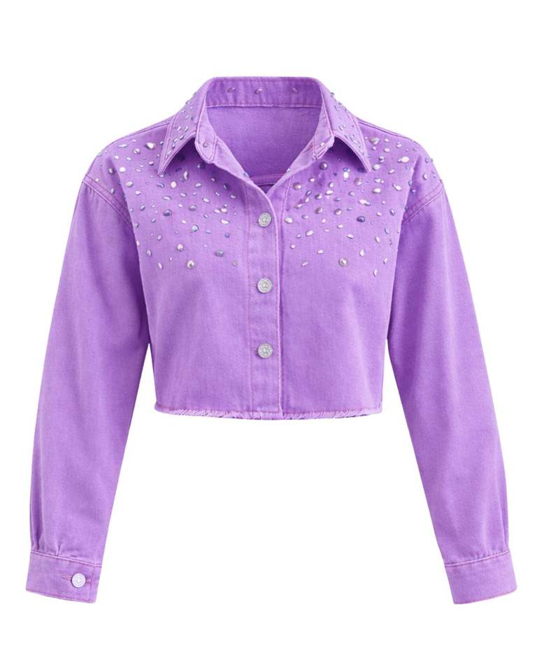 Veste en jean courte personnalisée pour femme, couleur lavande, ornée de strass et de boutons, à manches longues, style streetwear décontracté