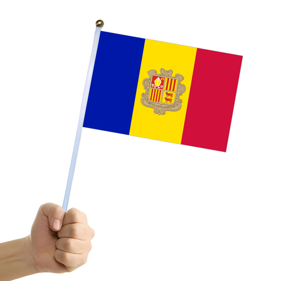 Logo personnalisé 14*21cm Polyester Andorre Mini Drapeaux à main Impression numérique Décorations de festival patriotique Drapeaux agités à la main