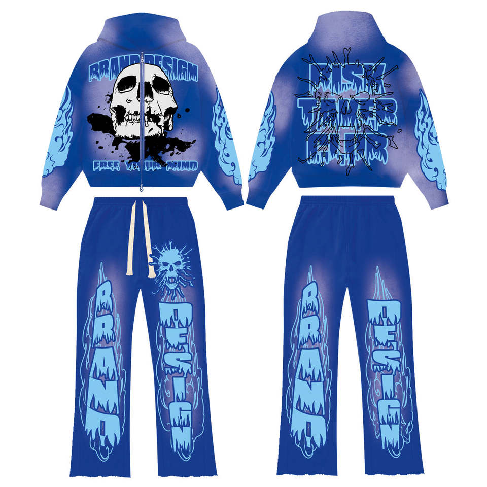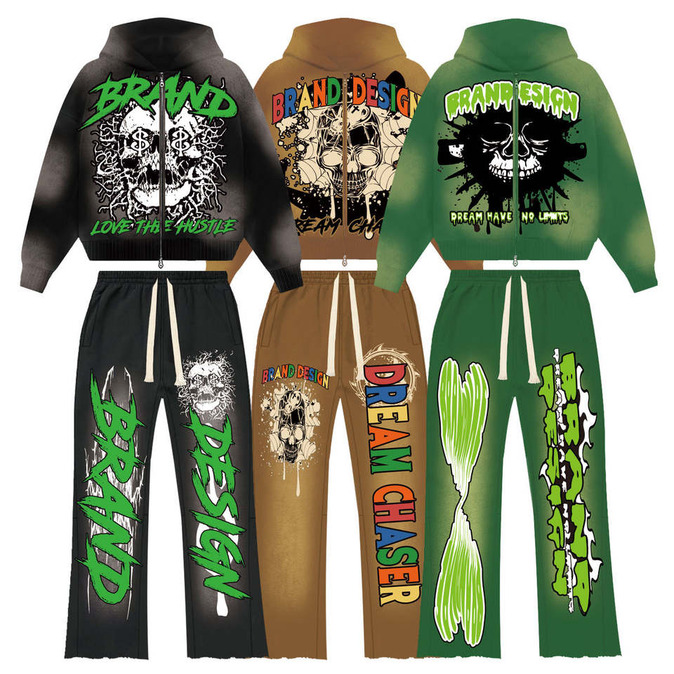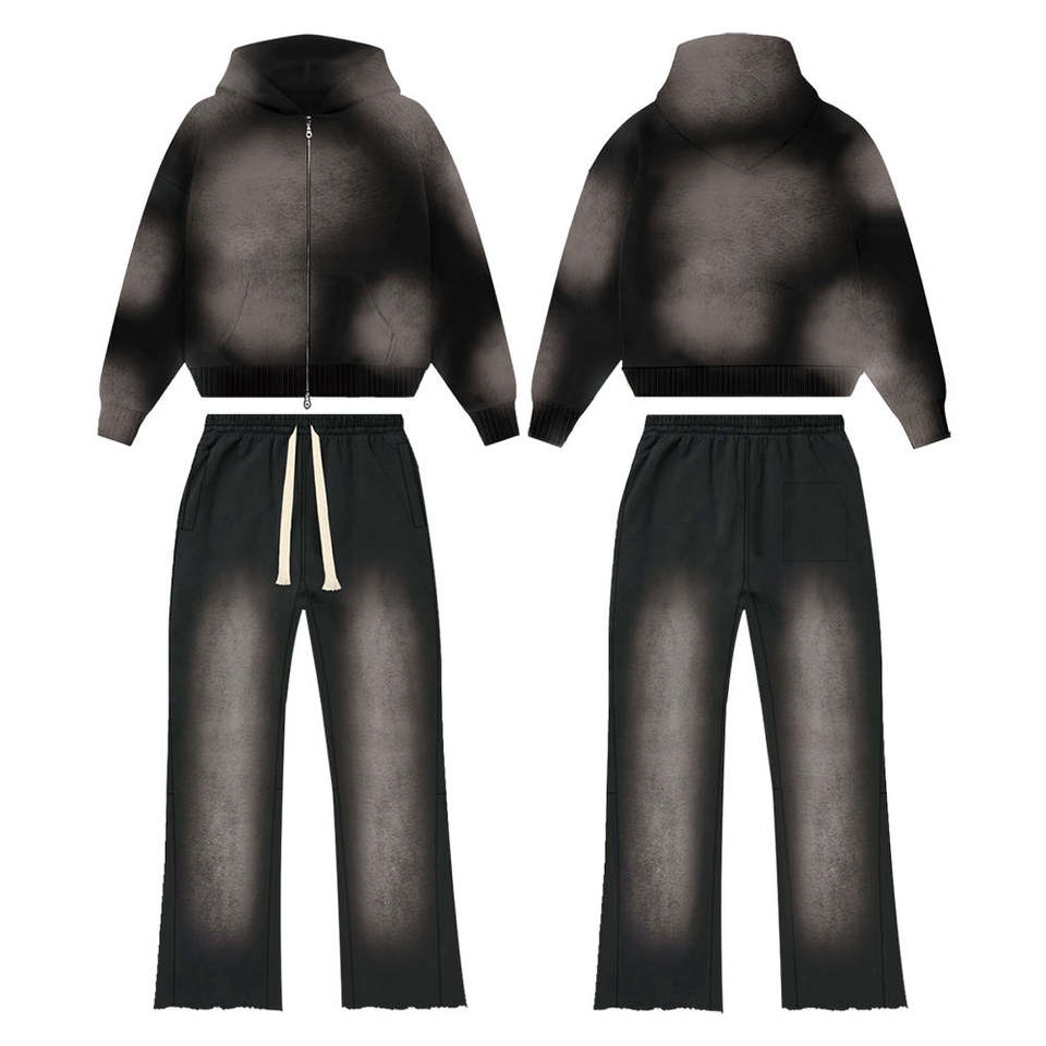 Sweat-shirt 100% coton avec logo personnalisé pour hommes, sweat à capuche délavé à l'acide et pantalon évasé avec fermeture éclair, ensemble 2 pièces décontracté pour l'hiver
