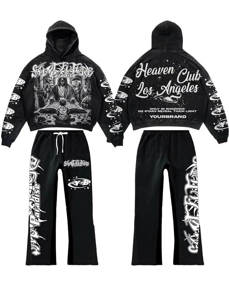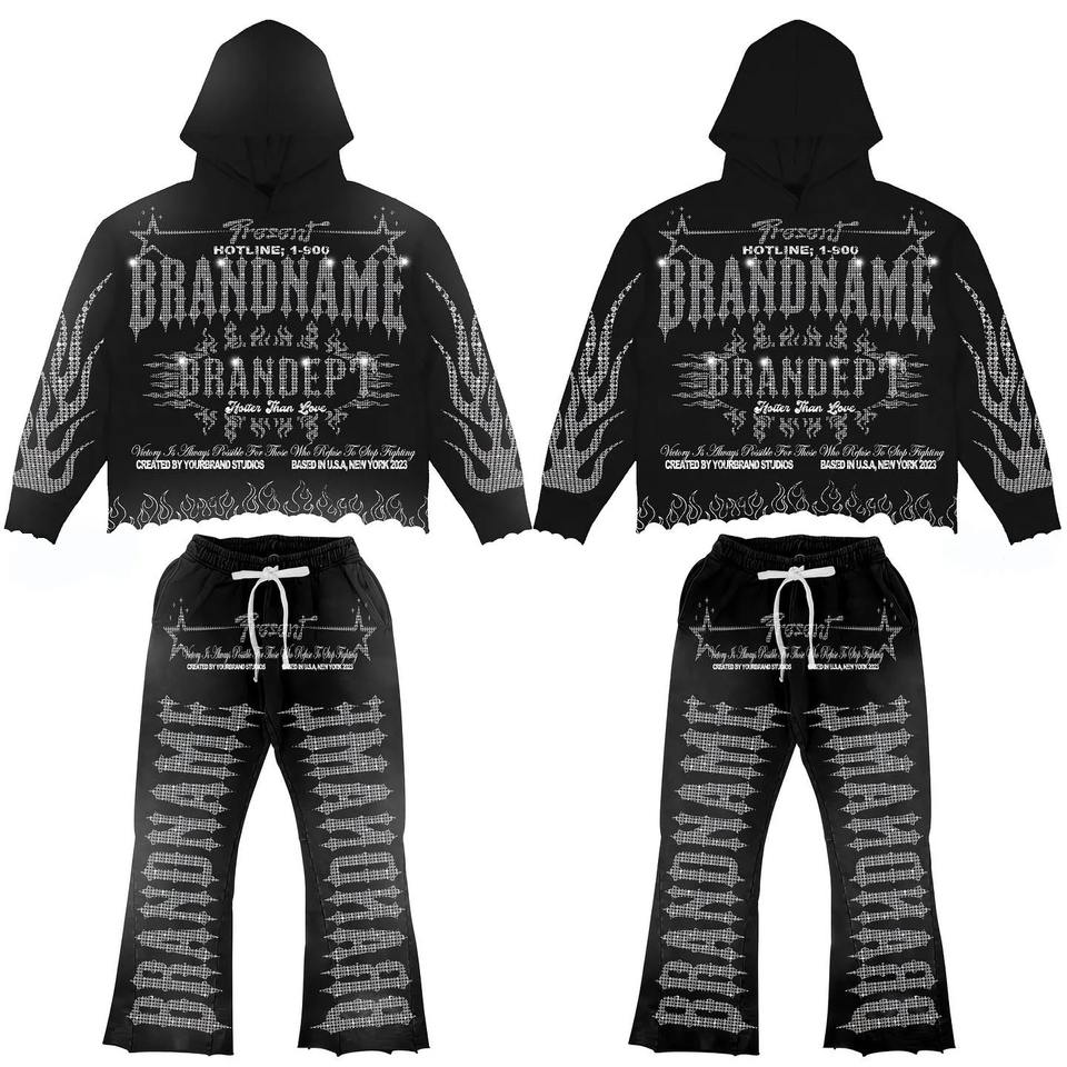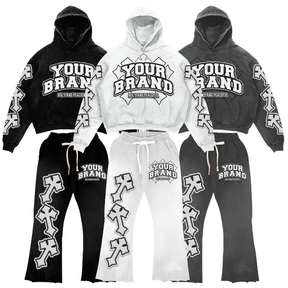 Logo personnalisé délavé à l'acide 100% coton pulls à capuche et pantalons évasés pour hommes ensemble de survêtements d'été décontractés 2 pièces pour hommes