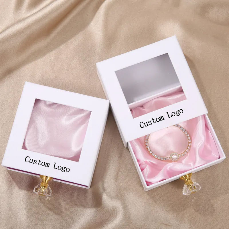 Boîte d'emballage en carton personnalisée avec logo pour bijoux, boucles d'oreilles, bagues, colliers, pendentifs, bracelets, fenêtre en PVC pour bijoux