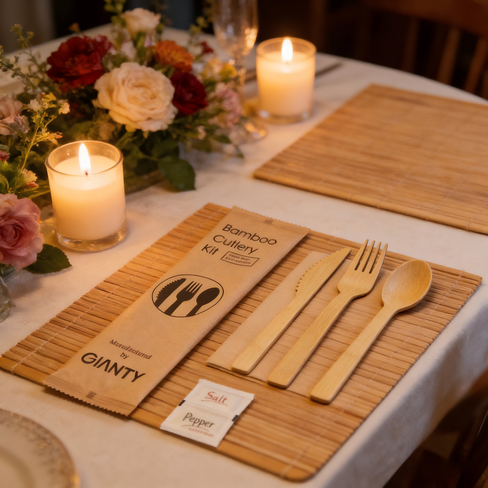 Couverts en bambou jetables avec logo personnalisé, emballés individuellement dans du papier kraft, ensemble de couverts en bambou pour les événements, les hôtels et les opérations de stations balnéaires