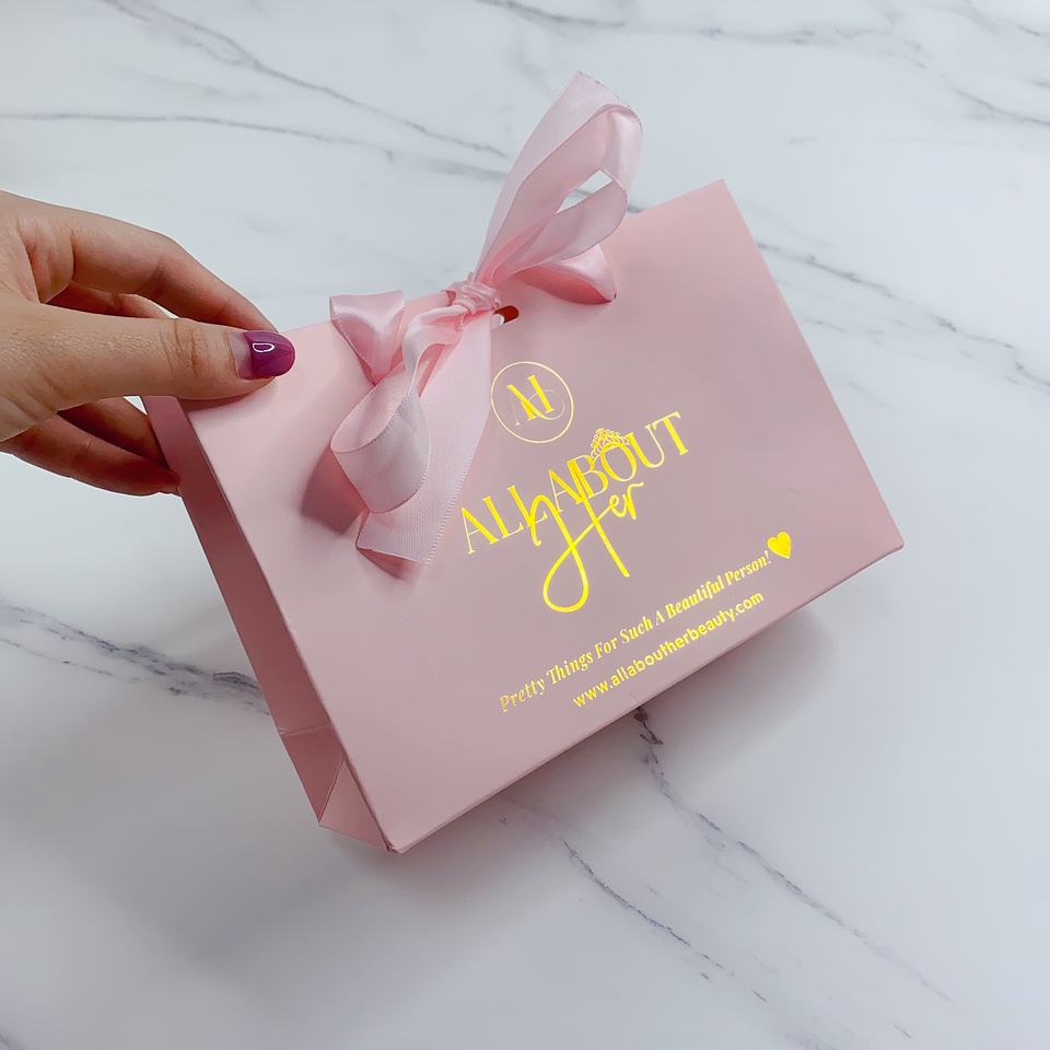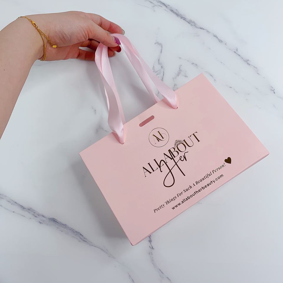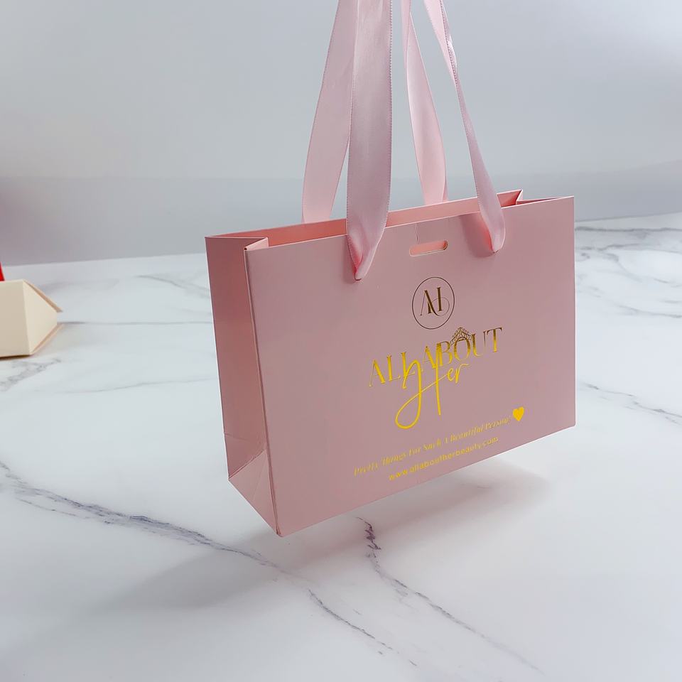Sac en papier rose de luxe avec logo personnalisé en feuille d'or pour l'emballage de bijoux, de cosmétiques et de lunettes, avec poignée en ruban