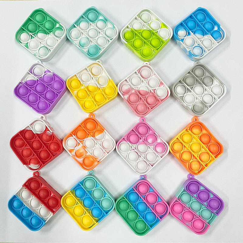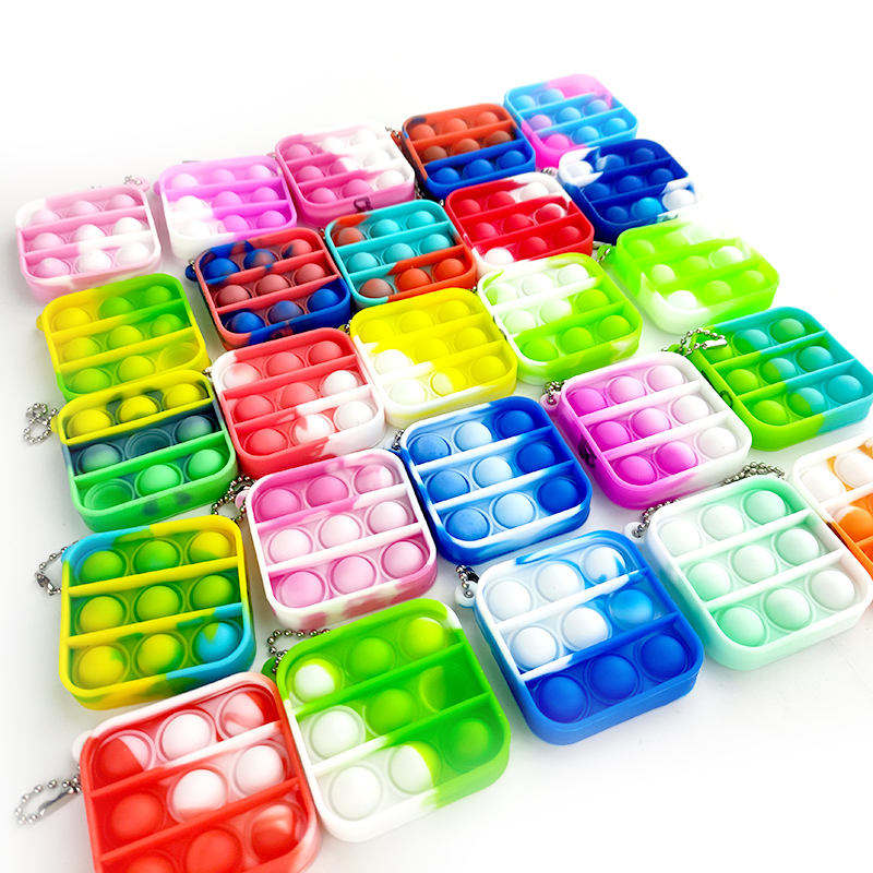 Porte-clés carré en silicone personnalisé avec logo, mini jouets sensoriels anti-stress à bulles, ensemble de jouets sensoriels en silicone arc-en-ciel