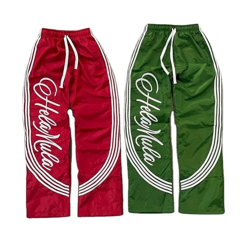 Pantalon de survêtement décontracté unisexe en non-tissé avec logo personnalisé, rayures incurvées, coupe ample, coupe-vent, grande taille, jambe large