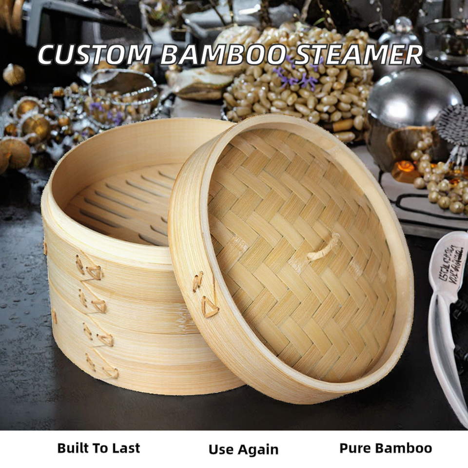 Panier vapeur à dim sum en bambou écologique, personnalisable avec logo, 2 niveaux, compatible gaz et induction, réutilisable et durable