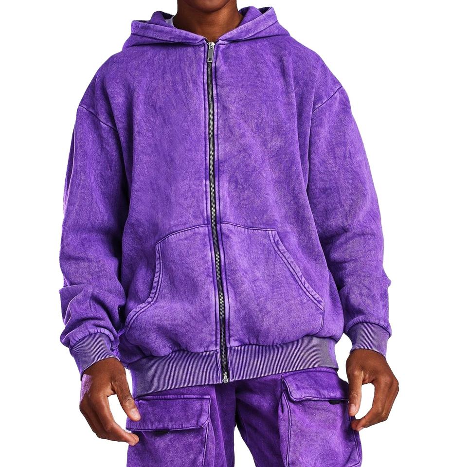Survêtement personnalisé à fermeture éclair et délavé à l'acide pour hommes, couleur unie, 100% coton, vêtements d'hiver respirants avec col à capuche2026