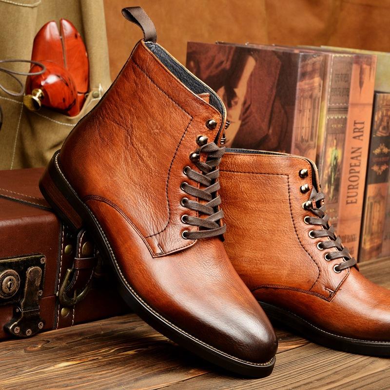 Bottes à lacets décontractées pour hommes en cuir véritable, imperméables, respirantes, avec talons rehaussants, pour l'hiver et l'automne