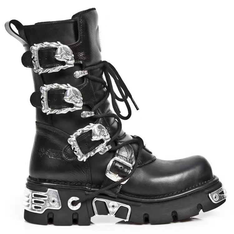 Bottes montantes rétro personnalisées pour hommes et femmes, style punk urbain espagnol, plateforme rock avec éléments moto et métalliques