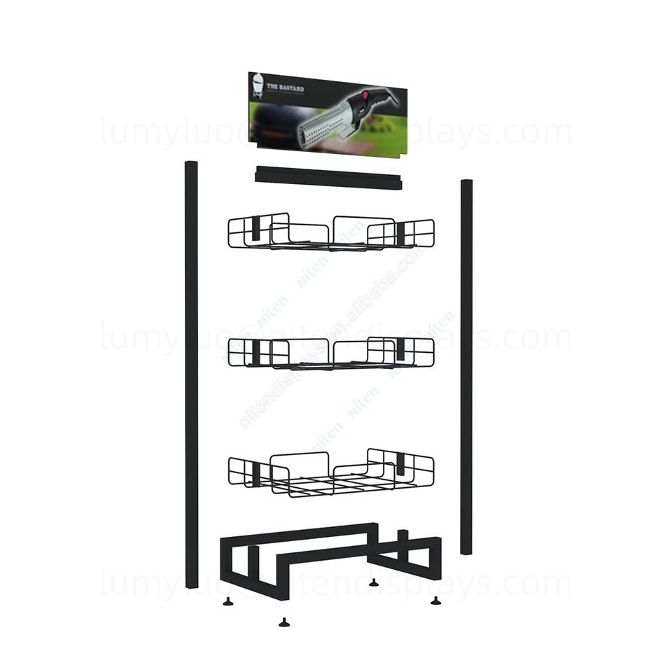 Étagères d'affichage en métal personnalisées, présentoir de sol double face avec paniers en fil métallique, support d'organisation d'outils réglable