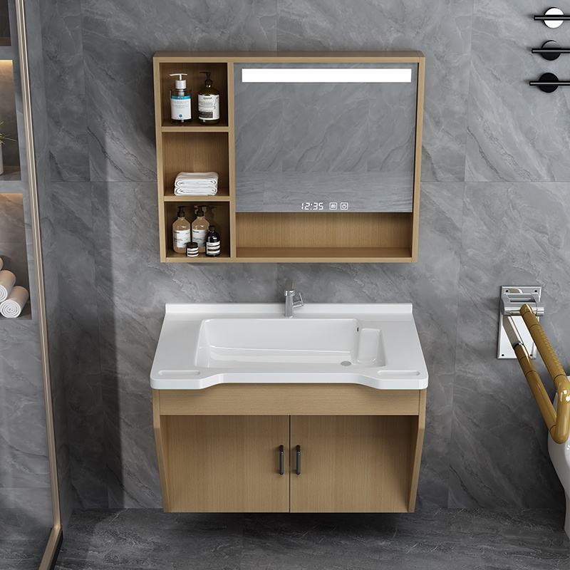 Armoire miroir intelligente murale multicouche en bois massif, style moderne minimaliste, personnalisée, pour maison de retraite, avec éclairage anti-buée et rangement pour salle de bain