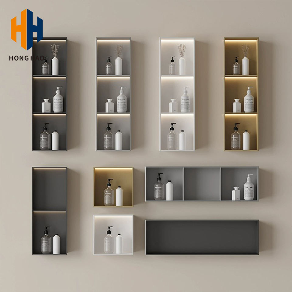 Niche de douche murale d'angle en acier inoxydable de style moderne personnalisée avec éclairage LED, étagère encastrée à trois niveaux, écologique