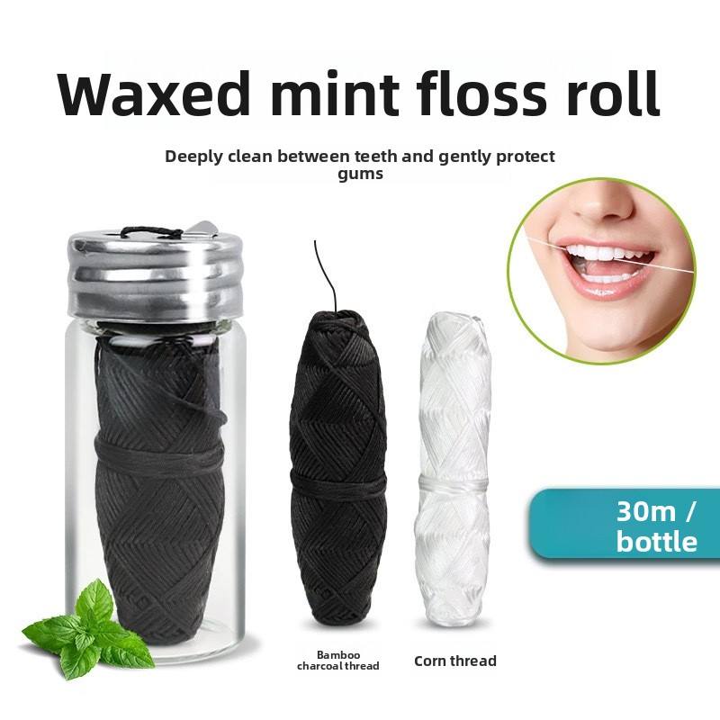 Fil dentaire plat biodégradable en soie de mûrier personnalisé, 30 m, en rouleau dans une bouteille pour le nettoyage buccal