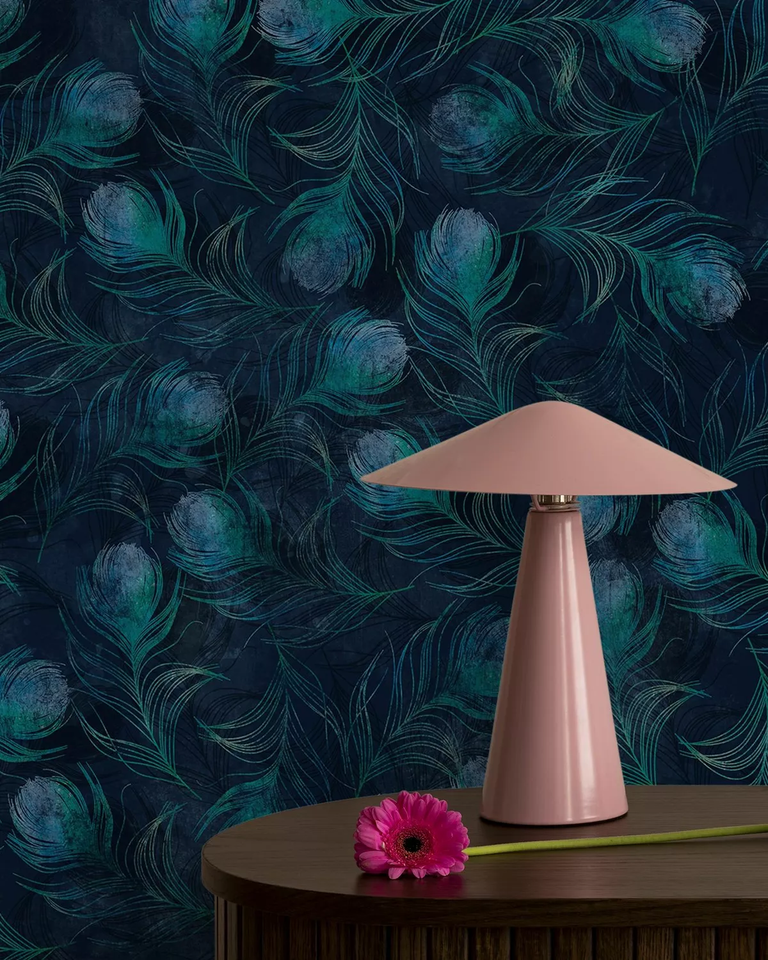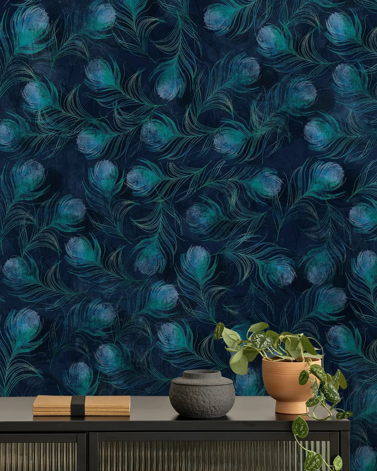 Le papier peint personnalisé en plumes de paon est utilisé pour les murs de fond de la chambre à coucher, du salon et du canapé.
