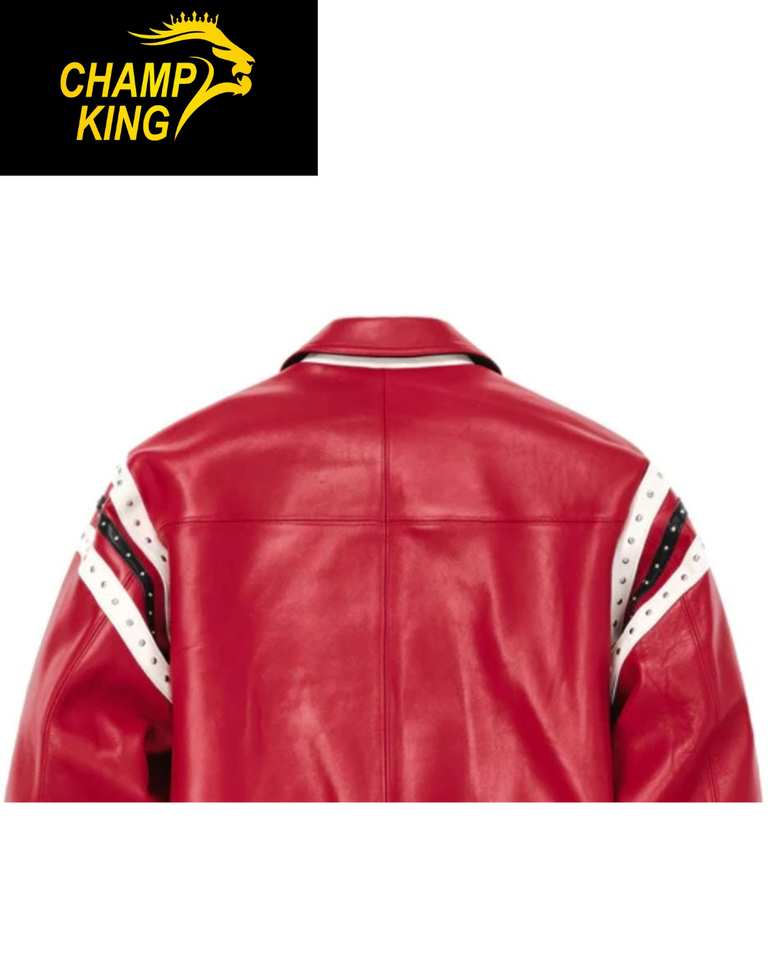 Veste en cuir rouge personnalisée « Pelle Pelle », veste bomber universitaire avec broderie sur le devant et fermeture éclair