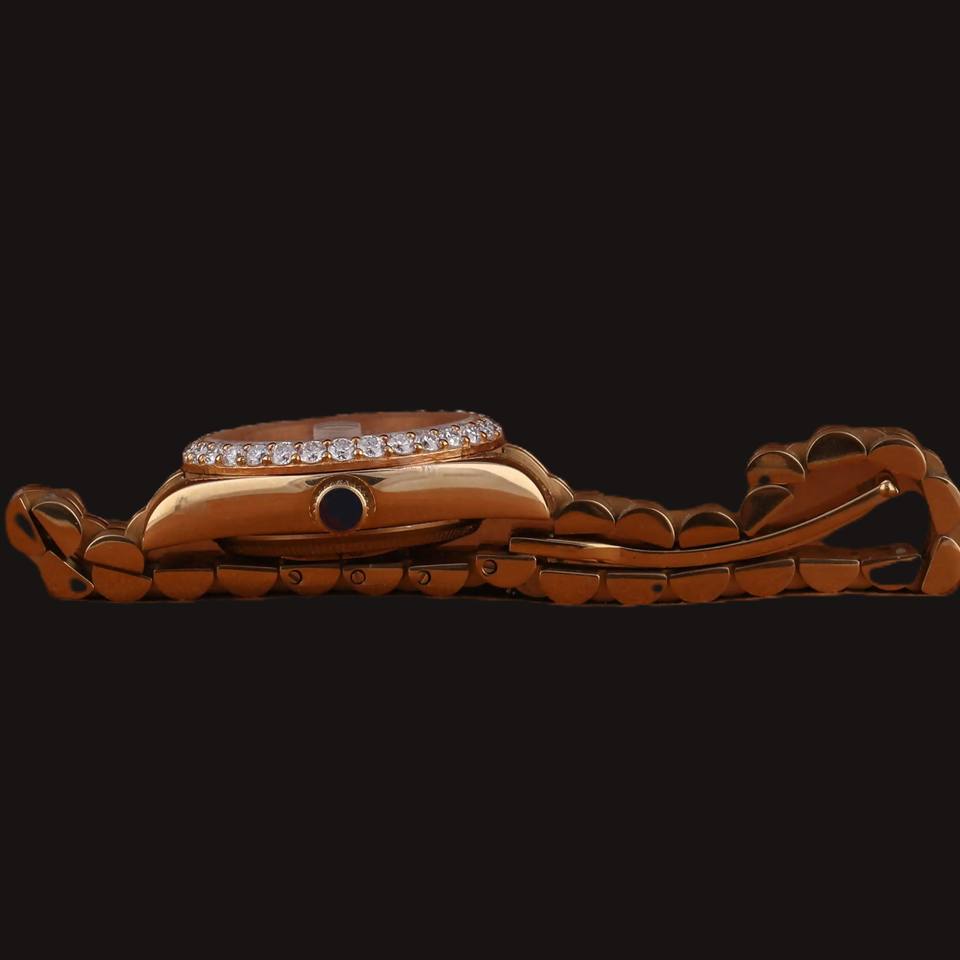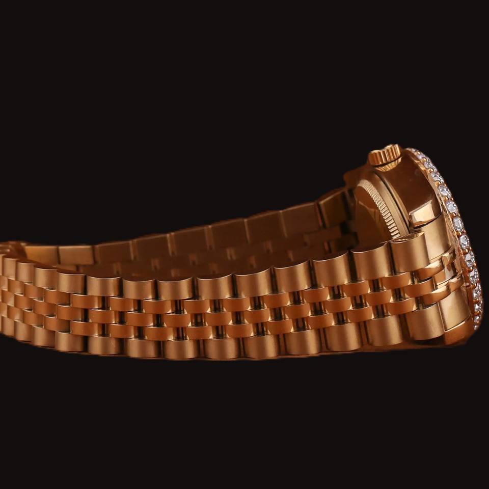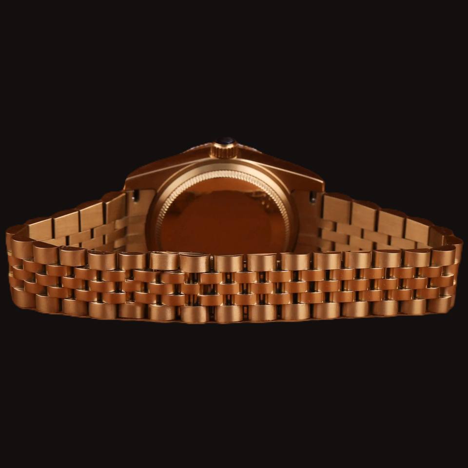 Montre personnalisée avec cadran rose, lunette sertie de diamants Moissanite, bracelet en acier inoxydable plaqué or avec fonction date automatique