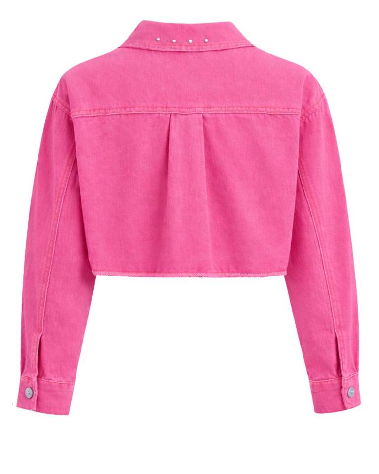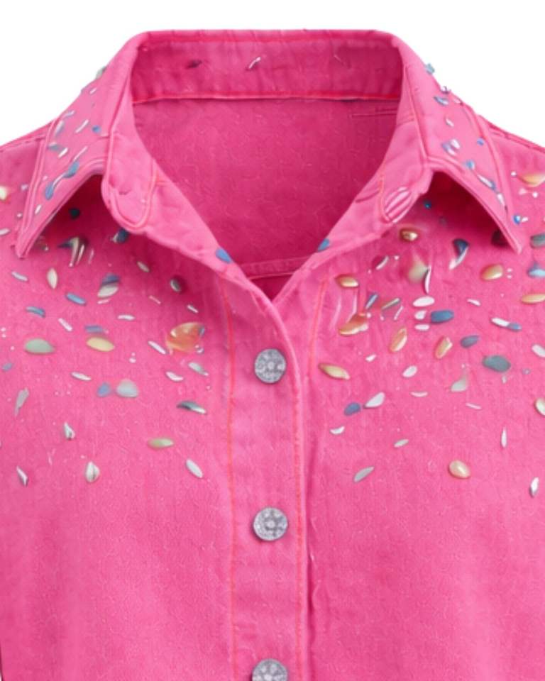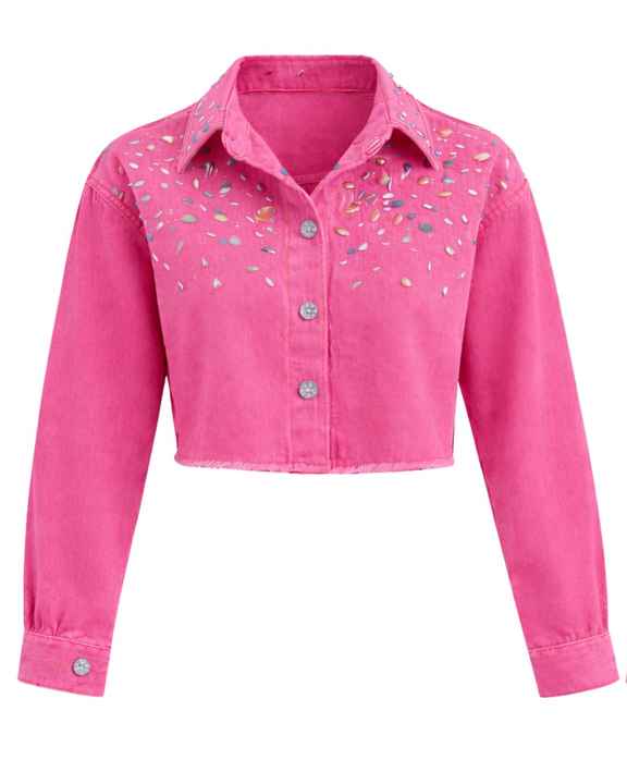 Veste en jean courte rose personnalisée pour femme avec fermeture boutonnée sur le devant ornée de strass, manches longues, style streetwear tendance