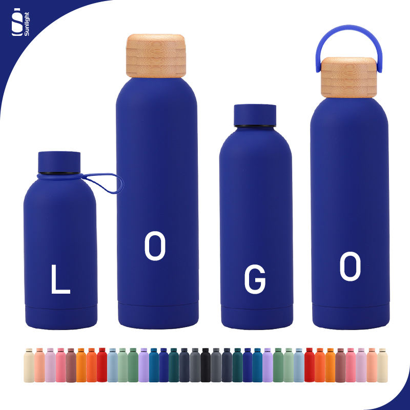 Bouteille d'eau en acier inoxydable 304, couvercle en bois de bambou, peinture caoutchoutée