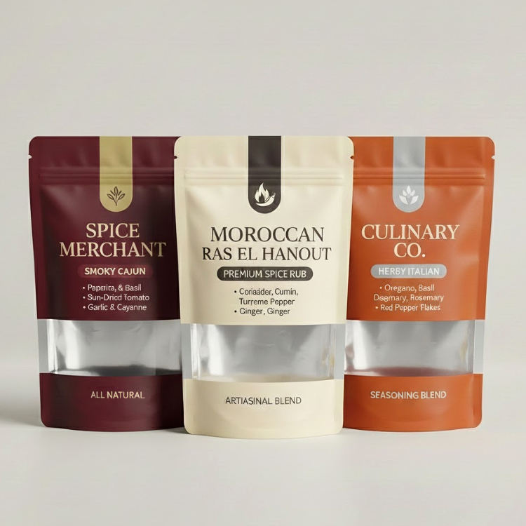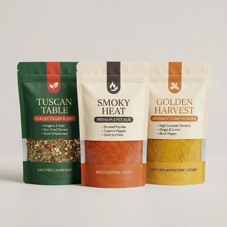 Sacs d'emballage en plastique personnalisés pour épices, piments, manioc, curcuma en poudre, graines de chia, assaisonnements