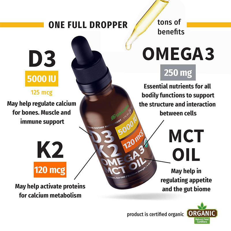Gouttes de Vitamine D3 K2 Biologiques Personnalisées à Marque Blanche avec Huile MCT et Oméga-3 30ml – Qualité Alimentaire OEM pour le Soutien Immunitaire des Adultes