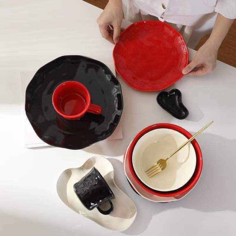 Service de table portable en céramique gaufrée, design minimaliste, couleur unie, professionnel et personnalisé, rouge, noir, blanc, compatible lave-vaisselle